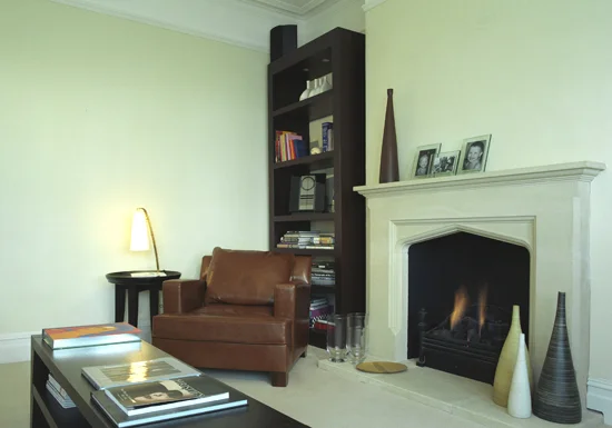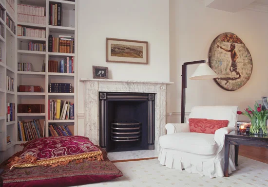 This library cabinetry fits snugly into the space next to the fireplace, wrapping around to completely fill the adjoining wall. The walls and library paint have been matched, creating a seamless colour scheme across the walls and shelving. Commissioned by CardenCunietti for a private residence.
