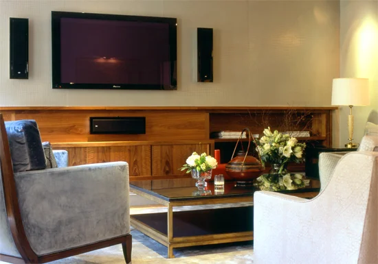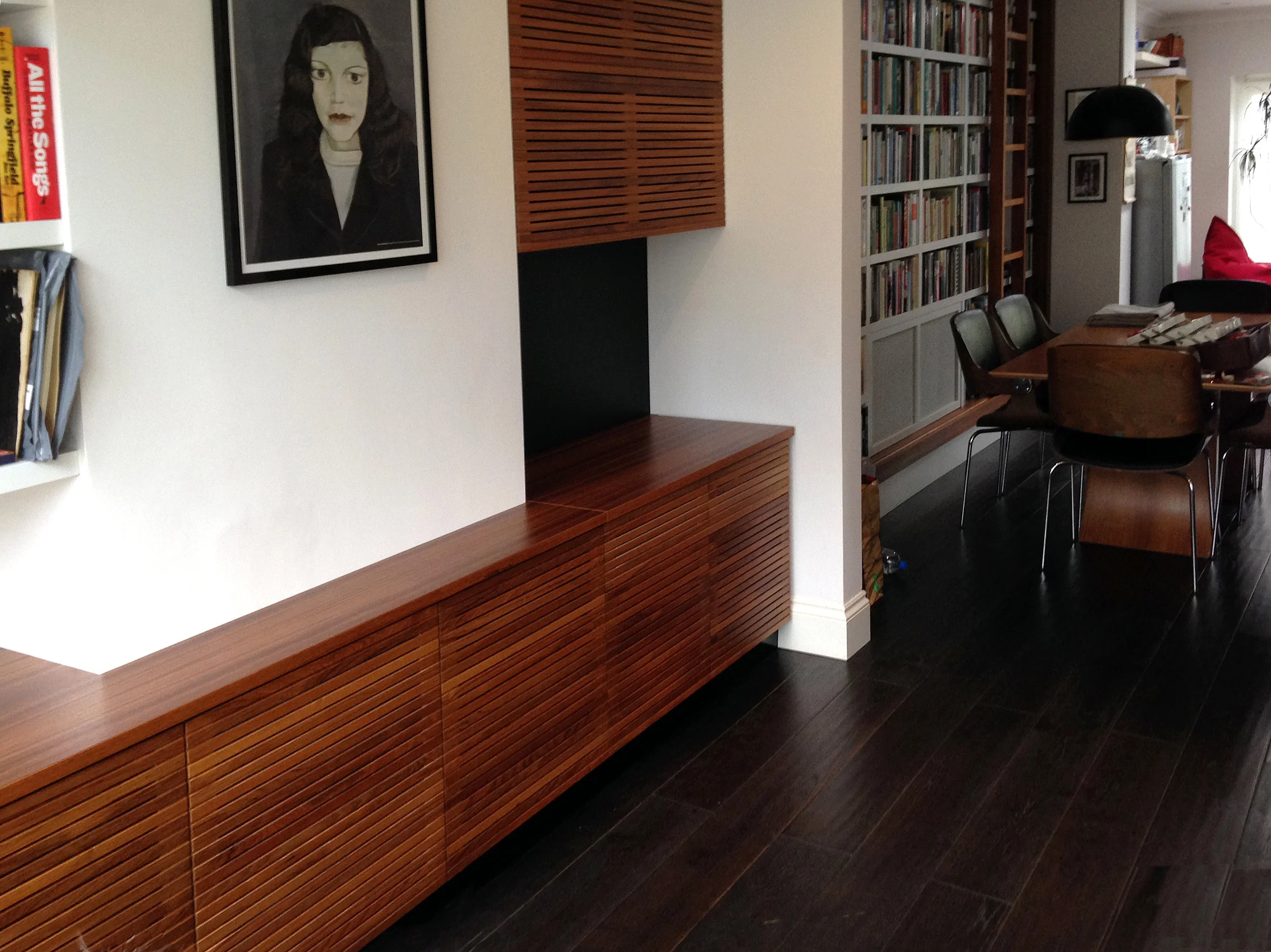 Built-in concealed turntable and TV cabinets with slatted teak fronts and a library with integrated rolling ladder