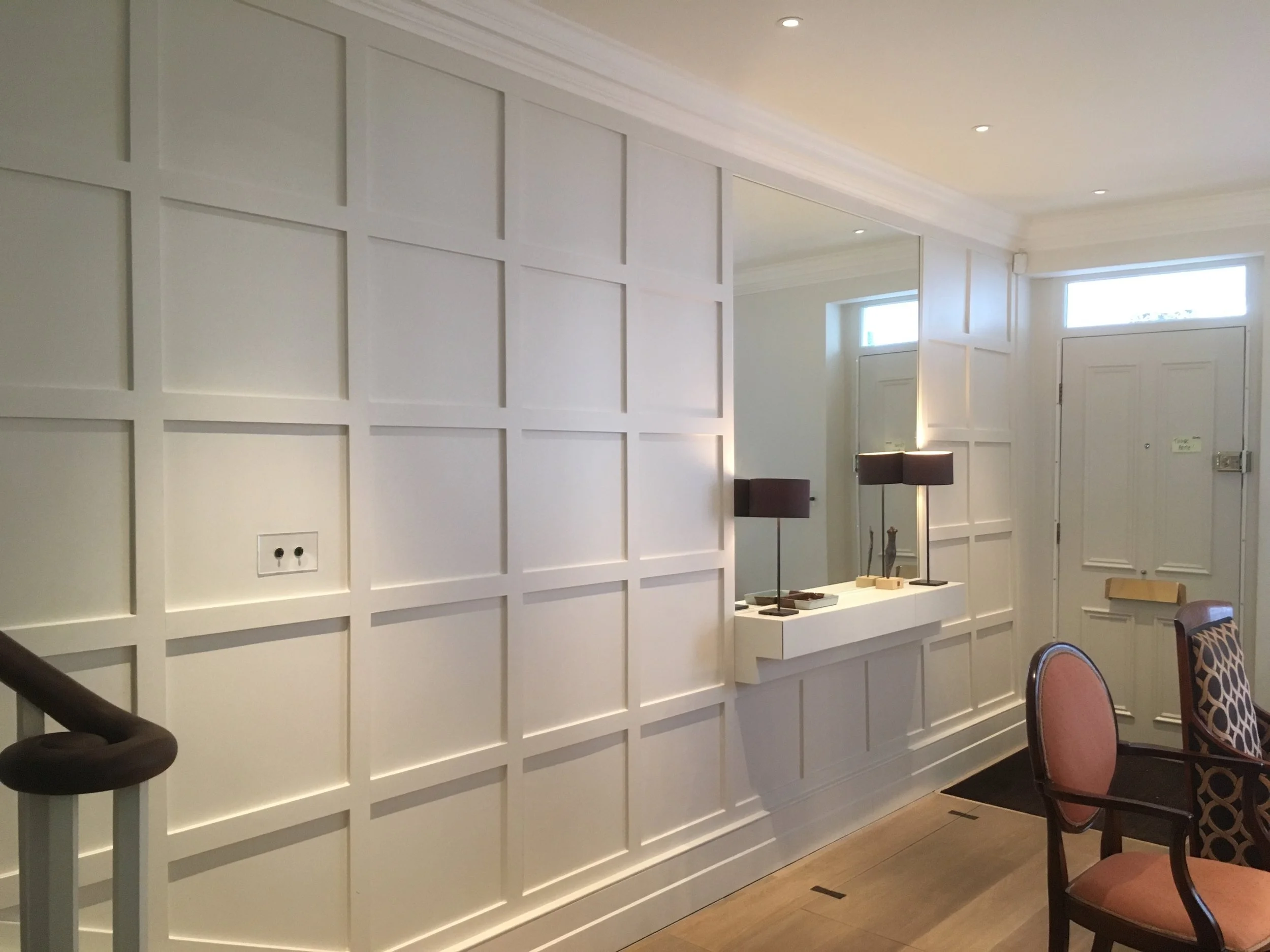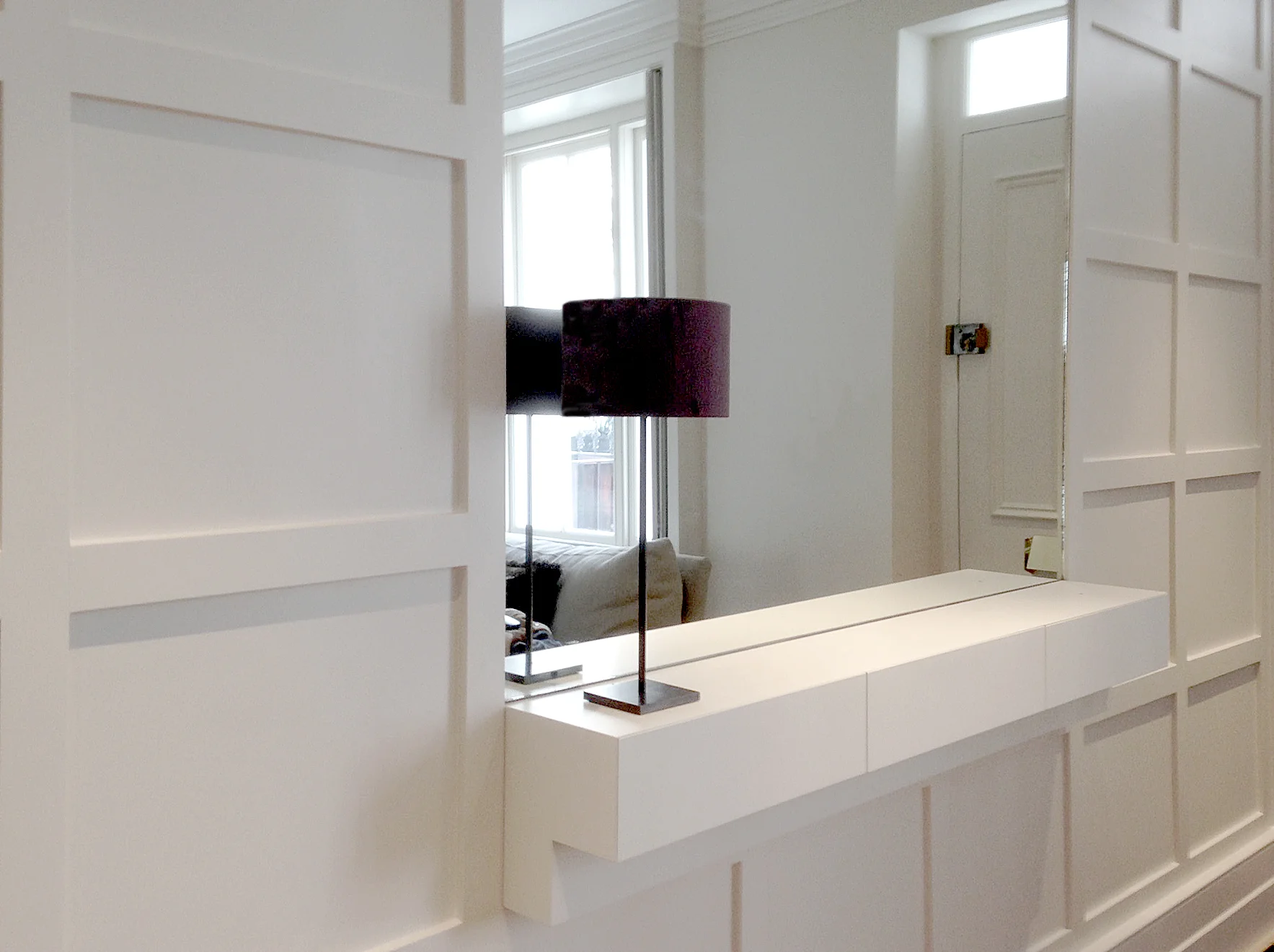 Frame and panel design with inset mirror and hallway display shelf, lacquered finish.