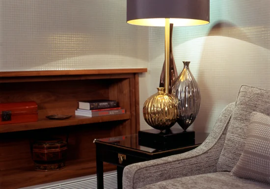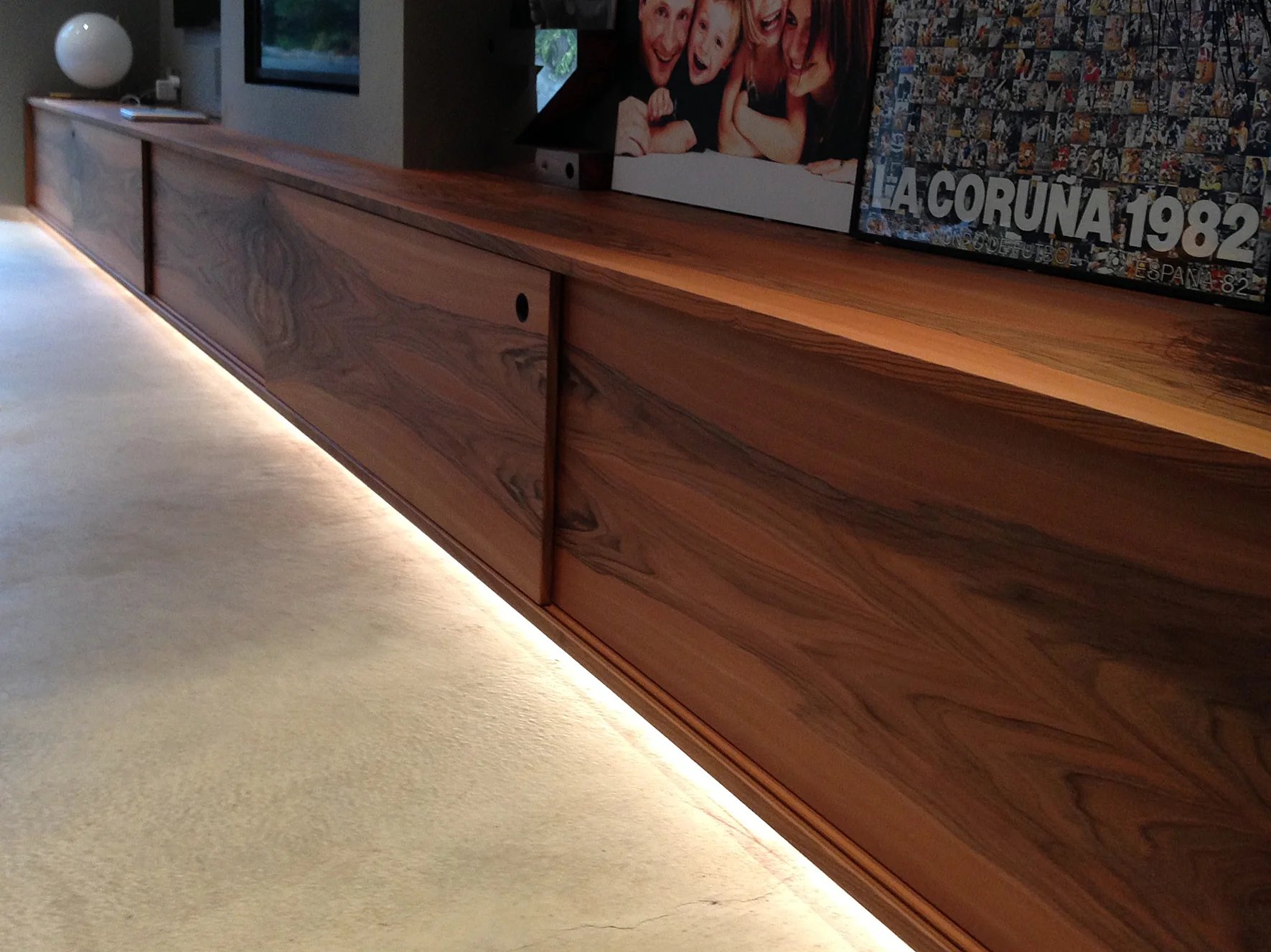 Built-in library cabinetry including feature niches with accent colour and downlights