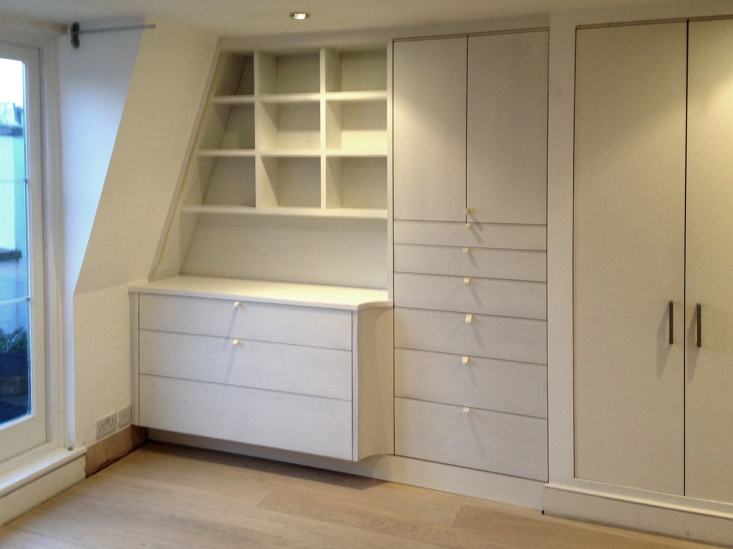 Chest of drawers, shelving, drawers, storage and wardrobes, lacquered finish. Commissioned for a private residence.