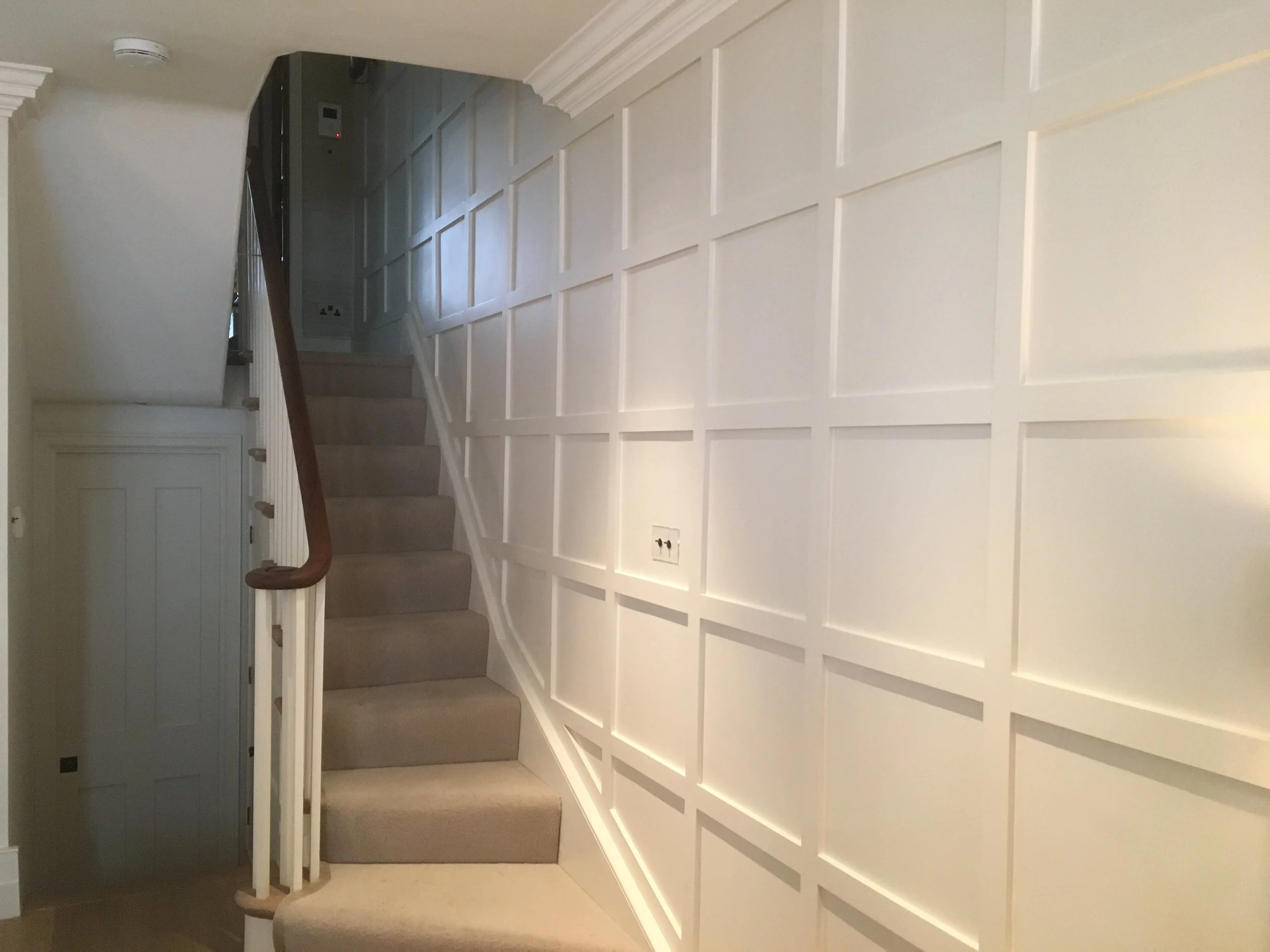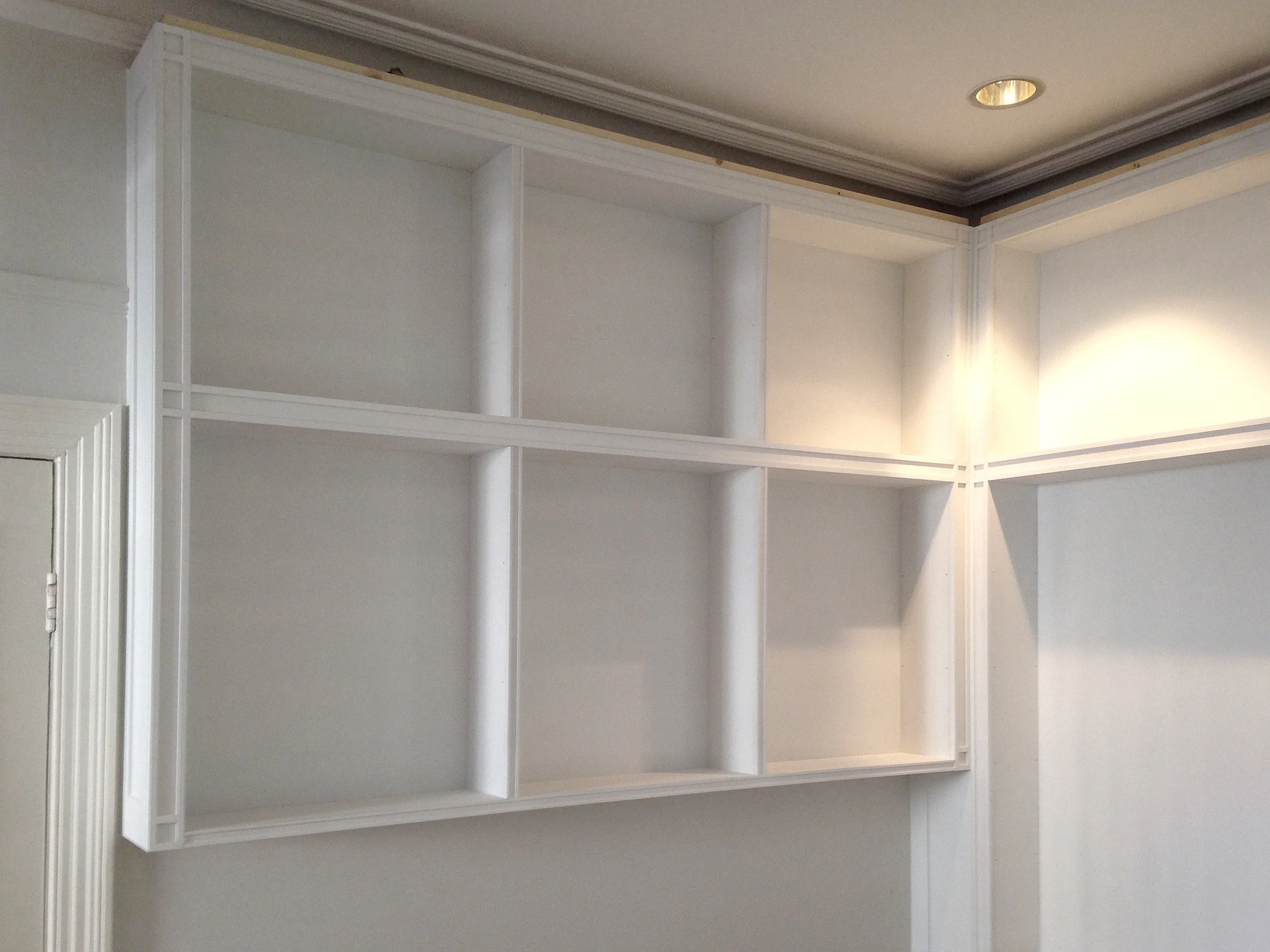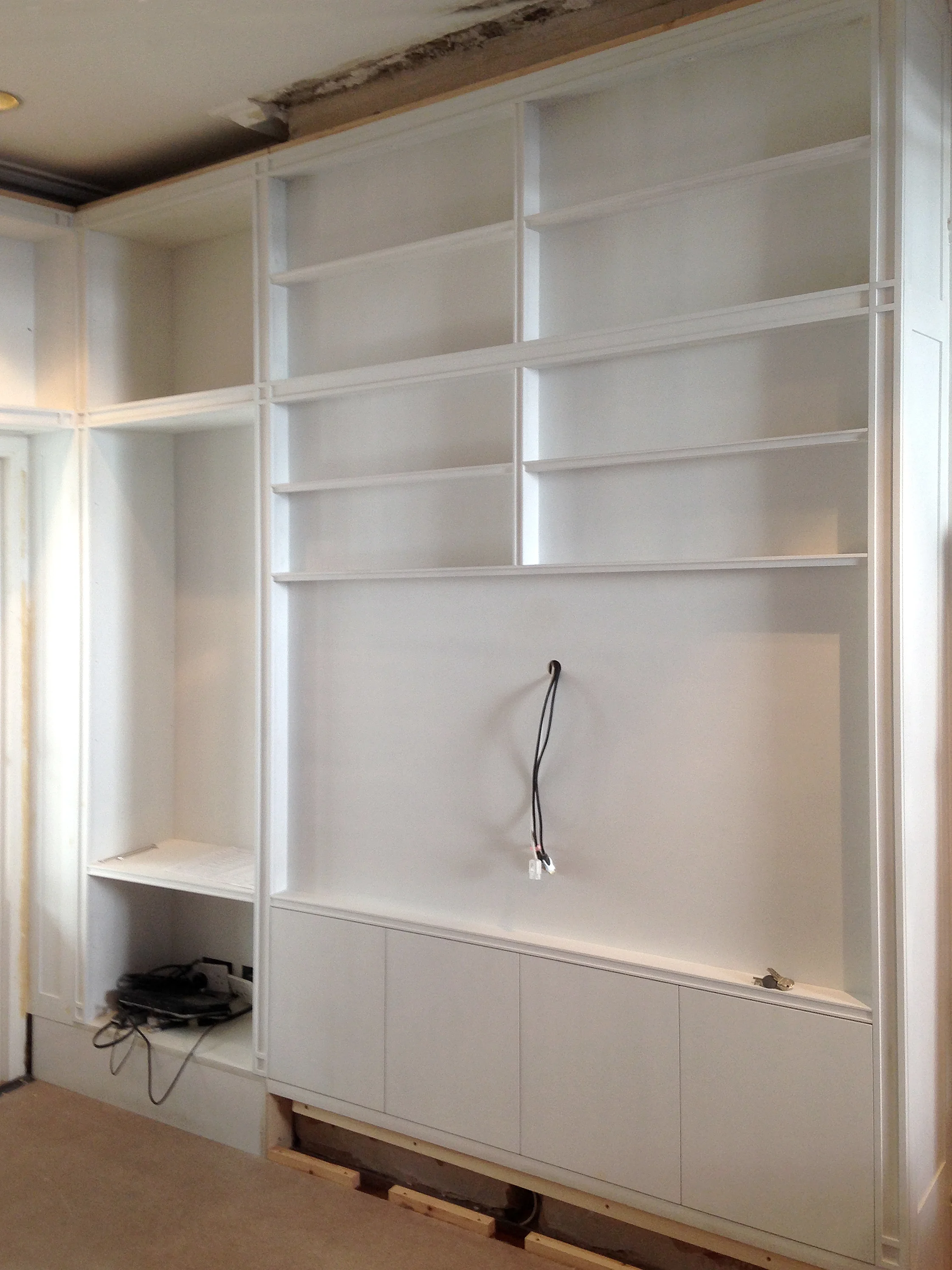 Built-in library with traditional detailing, primed & ready for restored cornice & hand-painted finish