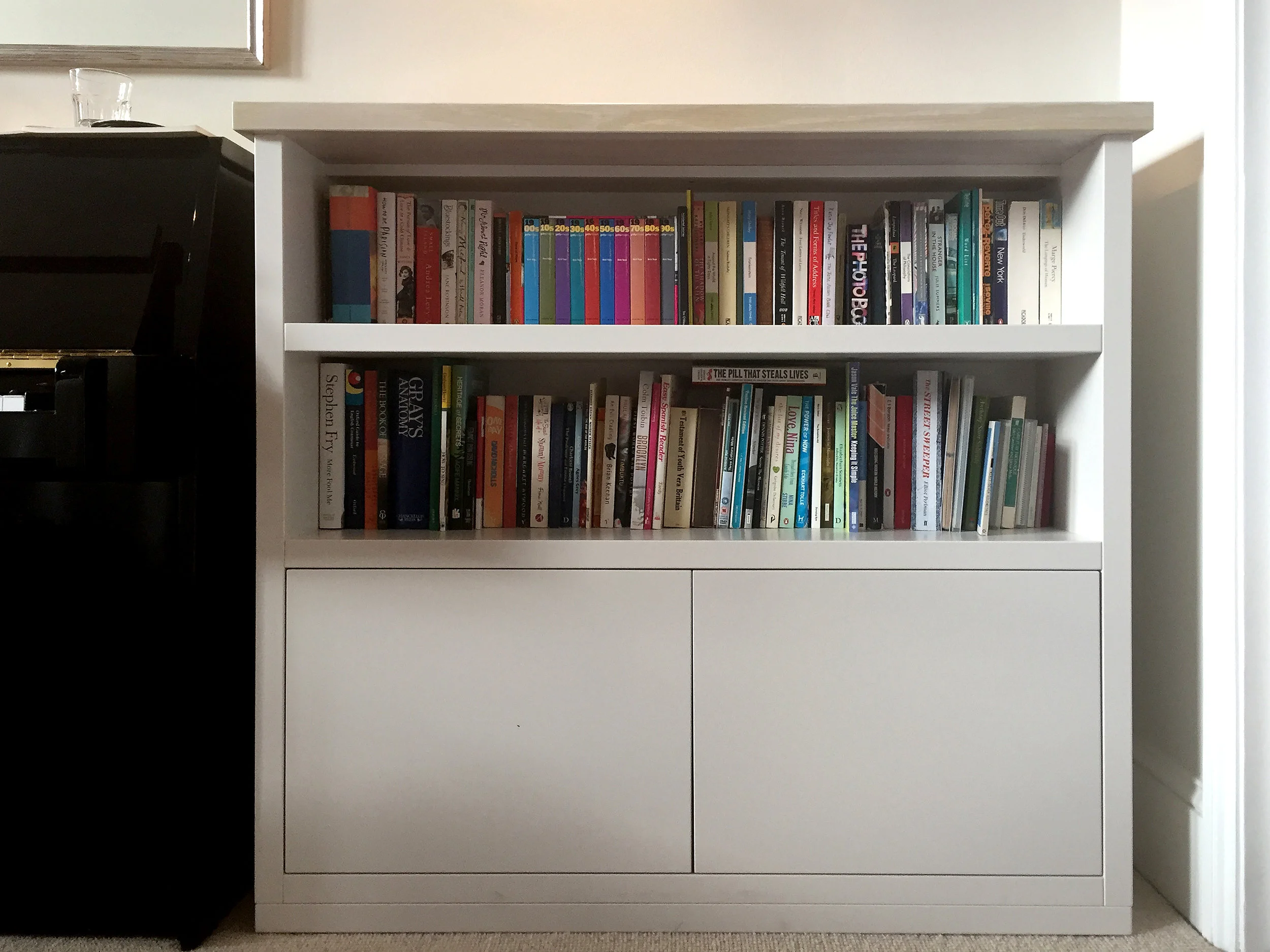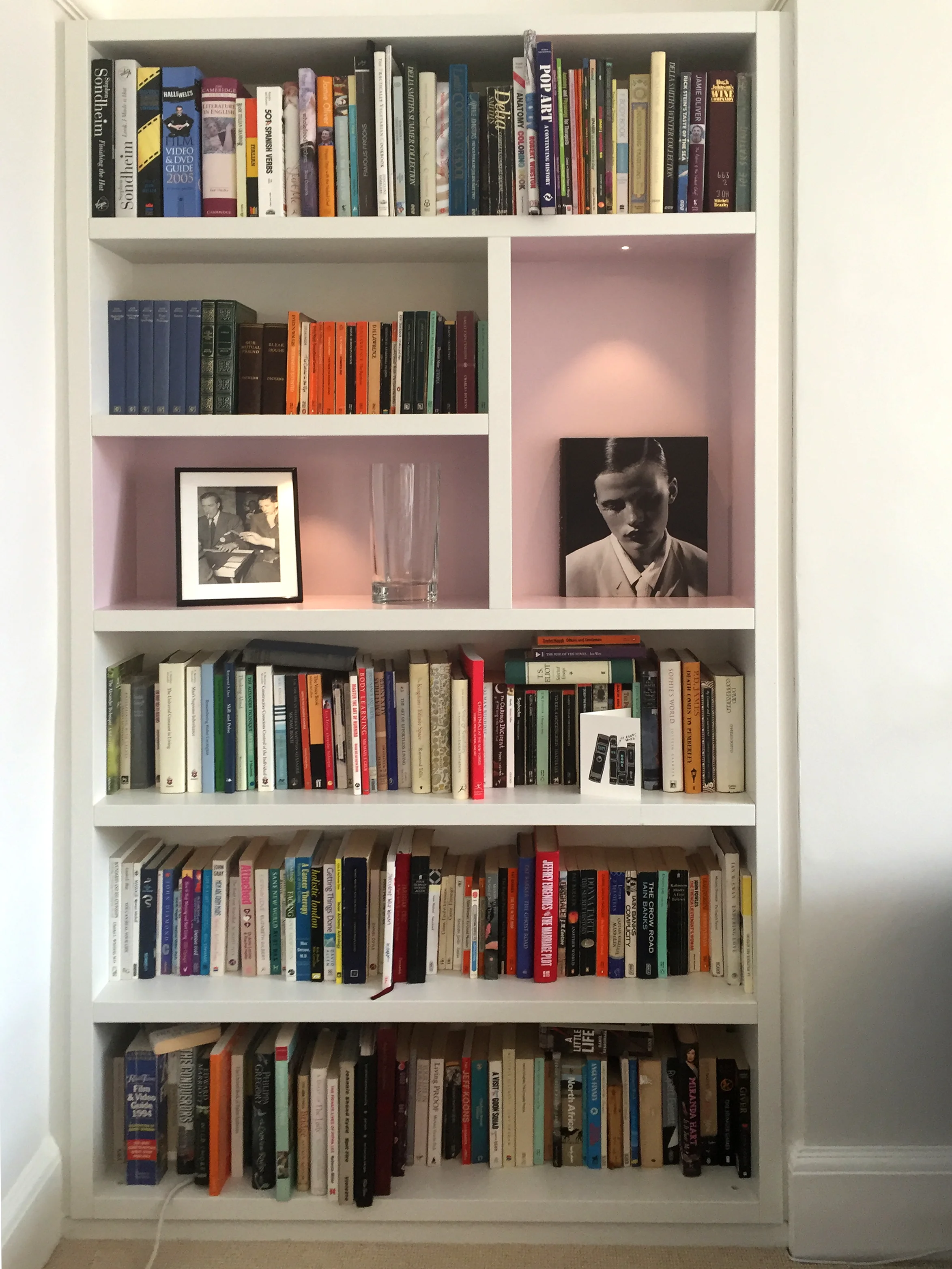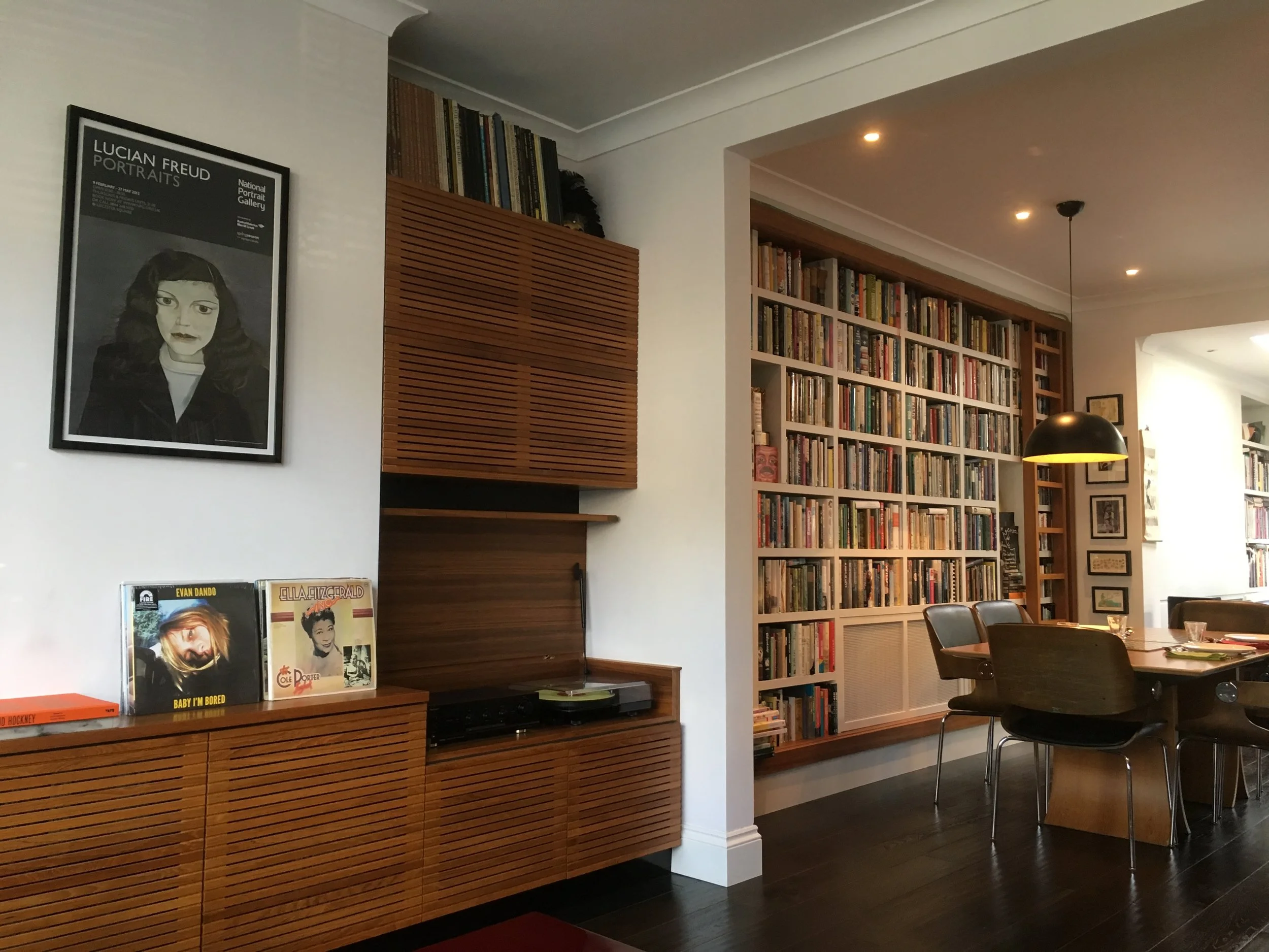 Fixed shelving for varying book heights and TV alcove, commissioned for a private client in London.